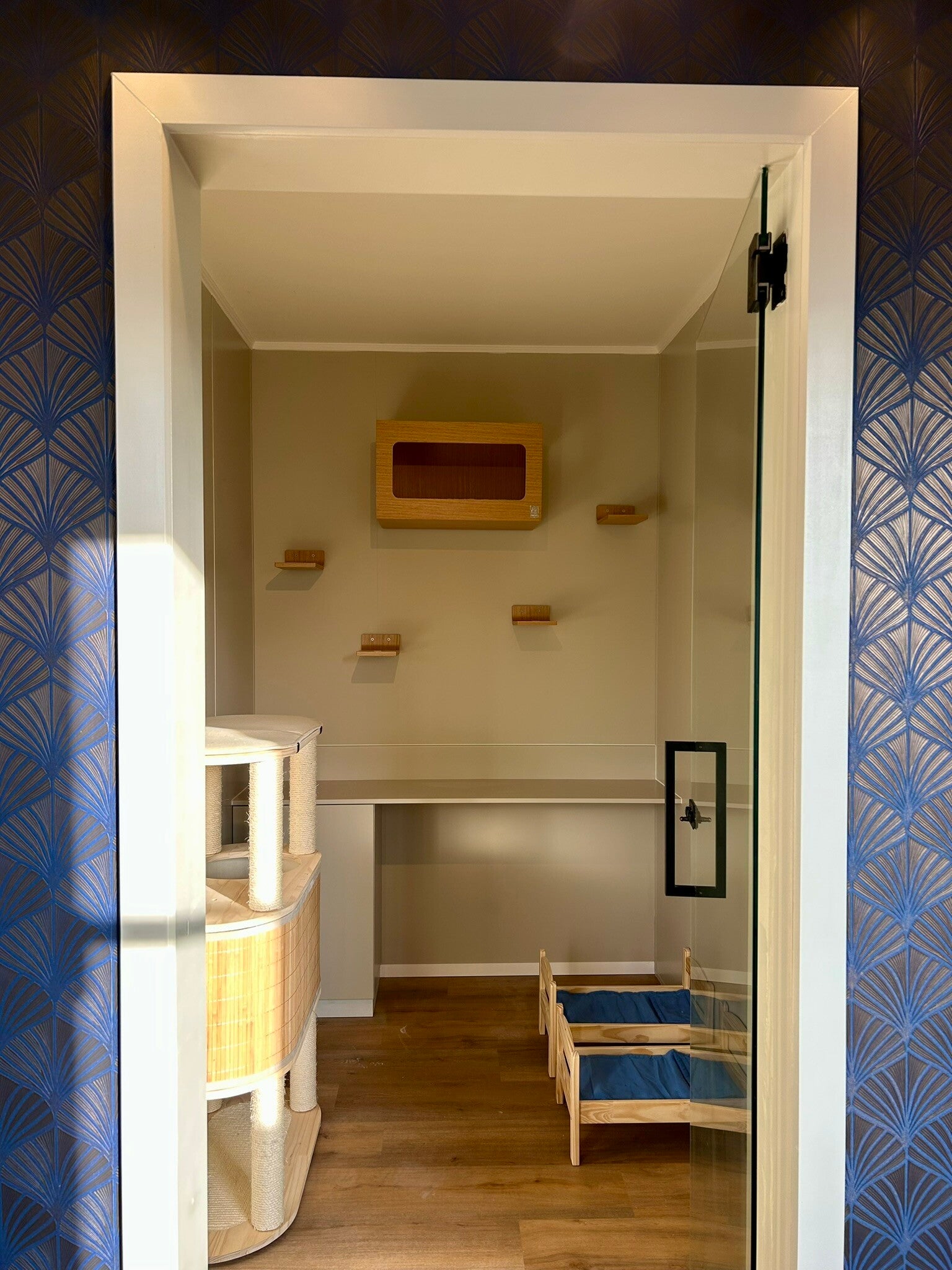 - Licht en rust: Ruime, hoogwaardige suites zonder tralies of hokjes. Glazen deuren laten overvloedig natuurlijk daglicht binnen, wat het welzijn van jouw kat stimuleert en bijdraagt aan een ontspannen verblijf. Katten zien geen vreemde katten uit andere suites, waardoor stress wordt geminimaliseerd en rust volledig centraal staat.